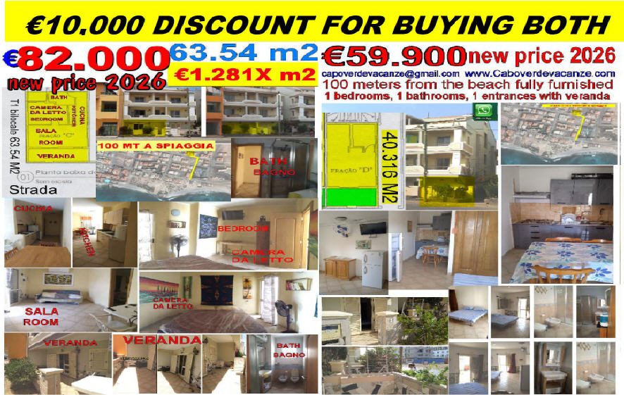 - 43.000 € 75M2 (533x M2 €) na plaży, 200mt z miasta, Port Ingles, T2 (w tym), 3pokoje +łazienka, Weranda, Courtyard, CapoVerdeVacanze można kupić za miesięczną cenę okupu czynszu.